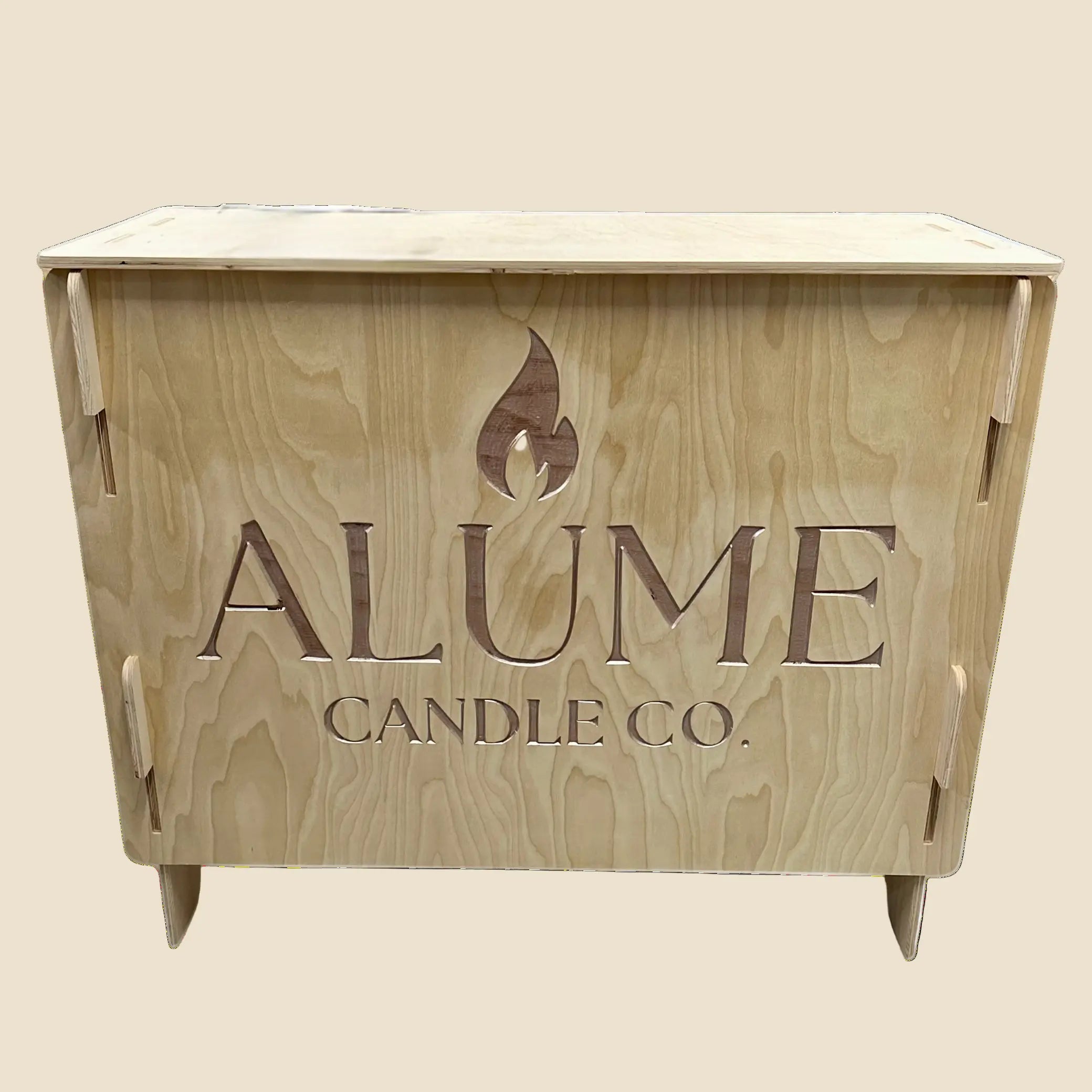 FREE SHIPPING - This modern, flat packed, retail display kiosk is designed for easy assembly and stylish presentation. With two shelves for ample storage, it's perfect for popups, craft or trade shows, weekend fairs, or a permanent store display. The unit breaks down into six pieces that quickly slide and lock together without any hardware or tools required, as shown in our listing video. Lightweight for transportation yet sturdy when assembled, this kiosk features your logo prominently on the front for a professional touch. Logos are V-Carved and painted in the color of your choosing. Want something unique? We offer customizations to our existing products as well as fully custom builds. Contact us to get started! Create a cohesive experience for your customers by pairing this kiosk with other products from our lineup. Dimensions: 44 inches wide, 20 inches deep, 36 inches tall. Made from 1/2 inch unfinished maple or birch plywood. This Item has a two week lead time.